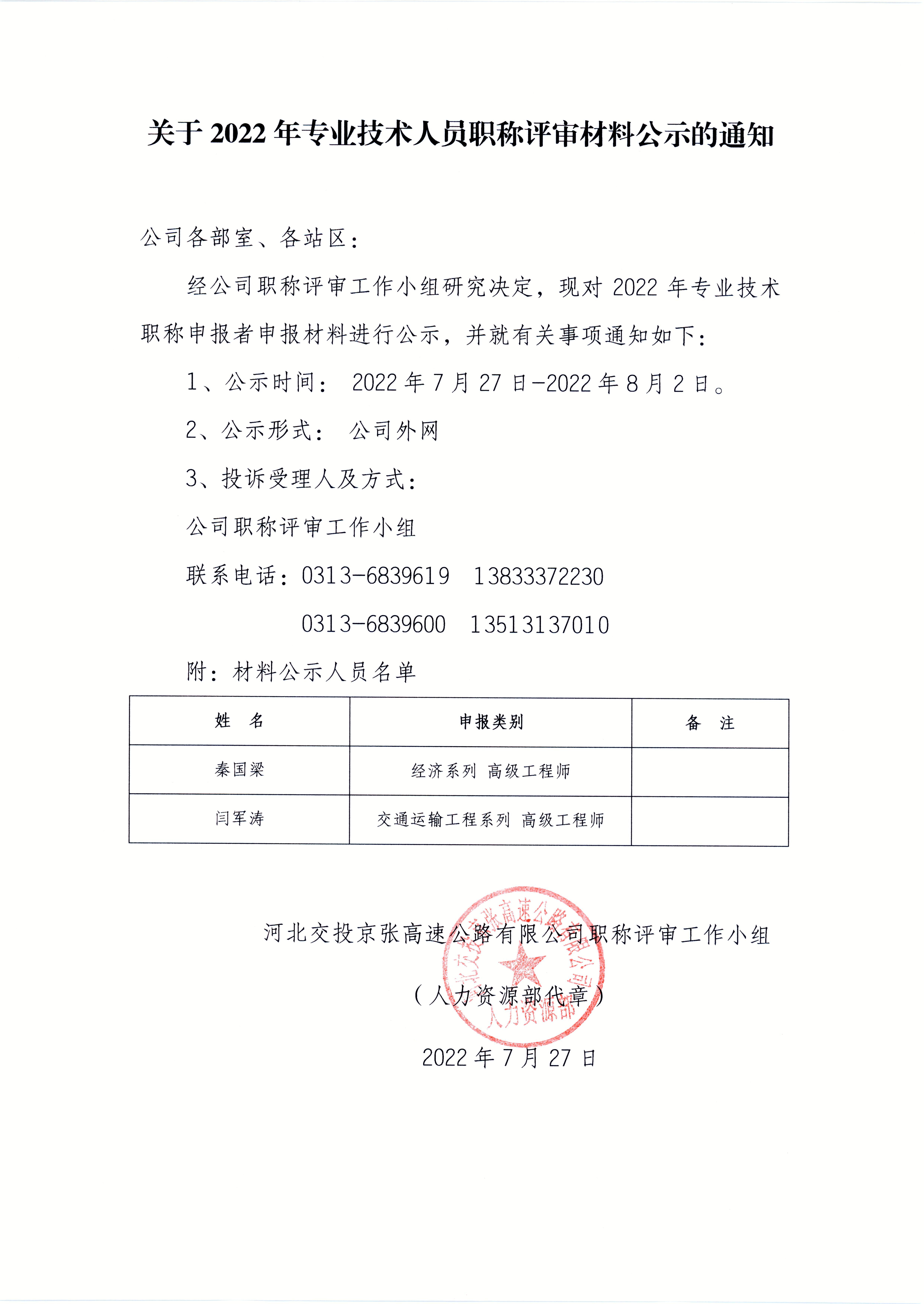 關(guān)于2022年專業(yè)技術(shù)人員職稱申報材料公示的通知